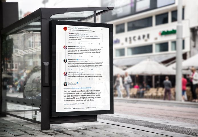 A screenshot of a twitter conversation between belgian virologist marc van ranst and dutch coronavirus skeptic willem engel was published as part of an advertising campaign on over 2,000 digital billboards in the netherlands.